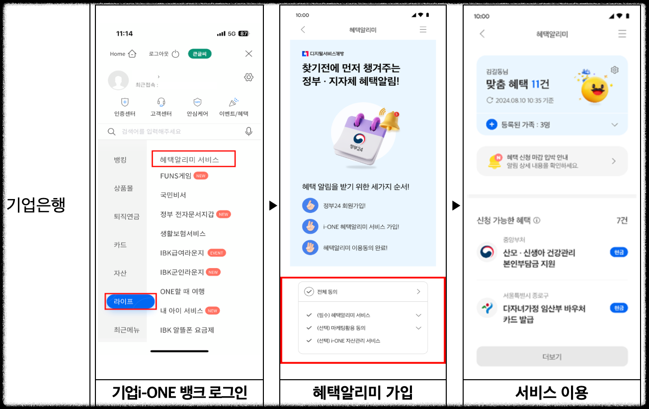 신한은행의 SOL 뱅크 앱이나 기업은행의 i-ONE 뱅크 앱에서 ‘공공서비스 즐기기’ → ‘혜택알리미’ 메뉴로 들어가 한 번만 신청하면 끝입니다.